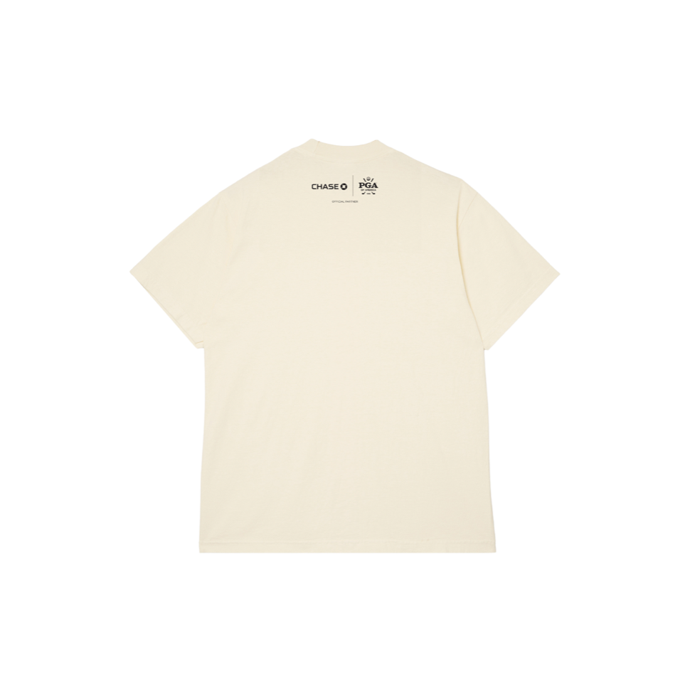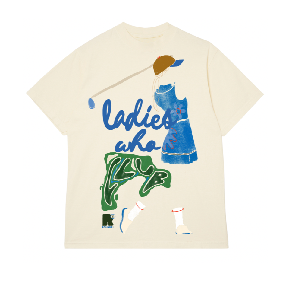 THE ART: This cream "Ladies who CLUB" tee, which was created in partnership between Round21, Chase, and the PGA of America, is a bold statement piece that celebrates women in golf and the power of art to move the game forward. Designed by Brooklyn-based artist Shema Love, known for her culture-centric and expressive visual work, this tee features a striking “Ladies who CLUB” graphic with a woman in mid-swing, driving progress. A blend of green, blue, and brown tones sweeps across the cream backdrop on the front right side of the tee, creating a visually dynamic design.
